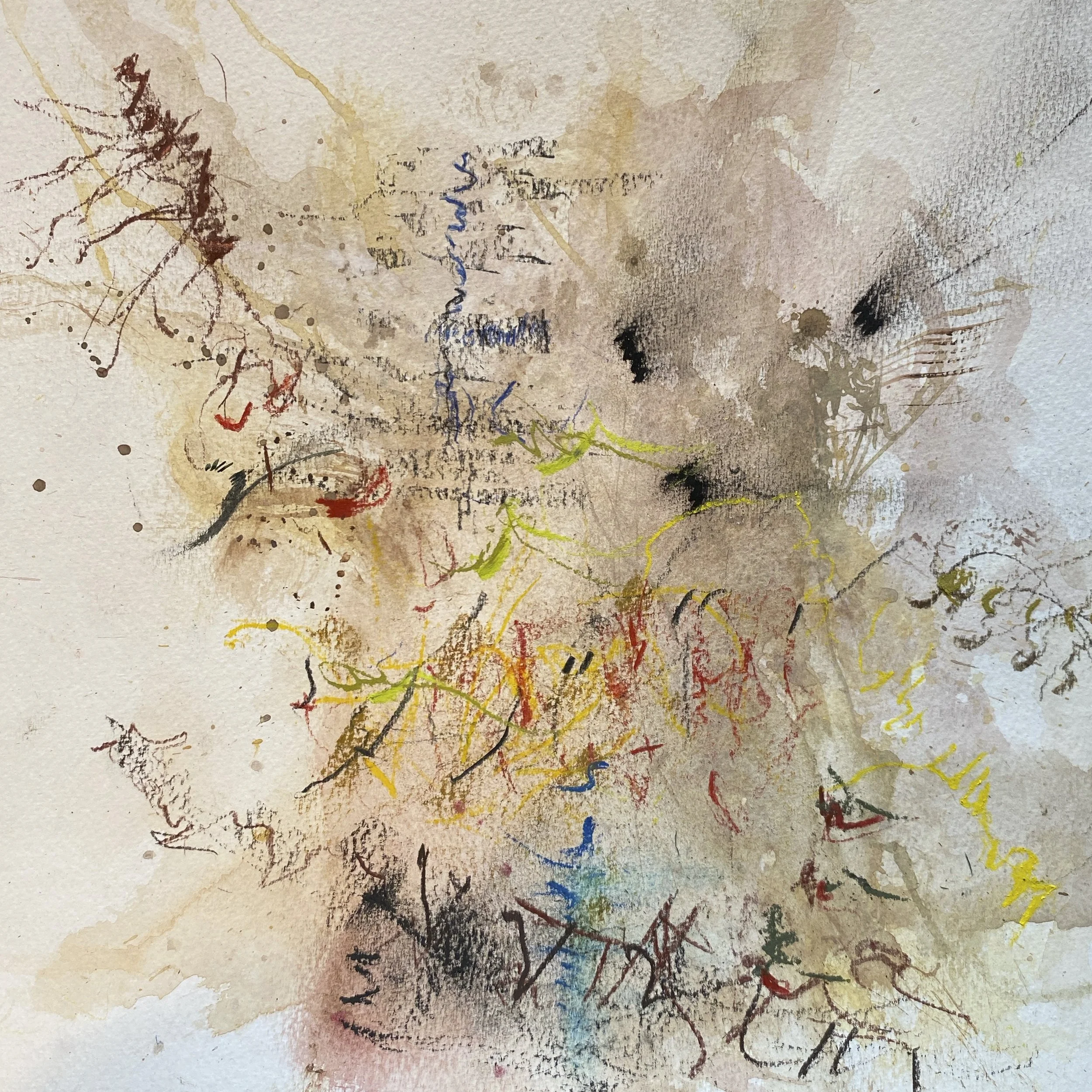 Water-based paint, water-soluble crayon on thick paper, float mounted under glass in white obeche wood frame. 53cm x 53 cm framed.